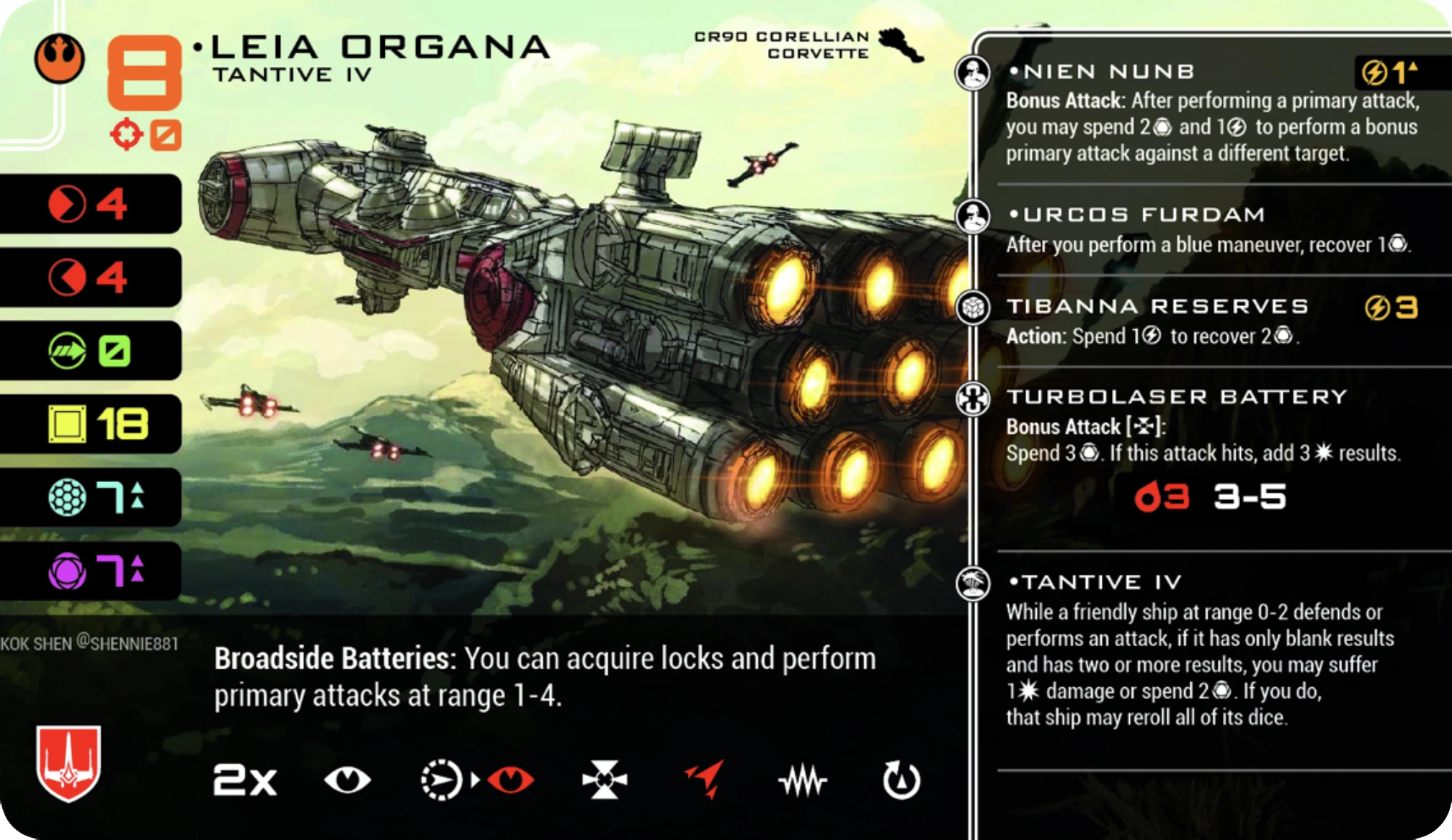 Quand un vaisseau allié à portée 0-2 défend ou effectue une attaque, s'il n’a que des résultats vierges et au moins 2 résultats, vous pouvez subir 1